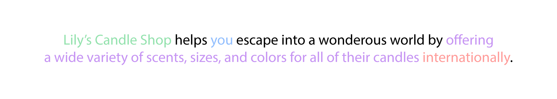 Let’s start with the first two…”Lily’s Candle Shop helps you escape into a wondrous world”. Next we talk about what we can provide…”Lily’s Candle Shop helps you escape into a wondrous world by offering a wide variety of scents, sizes, and colors for all of their candles.” Now we just need to add where!